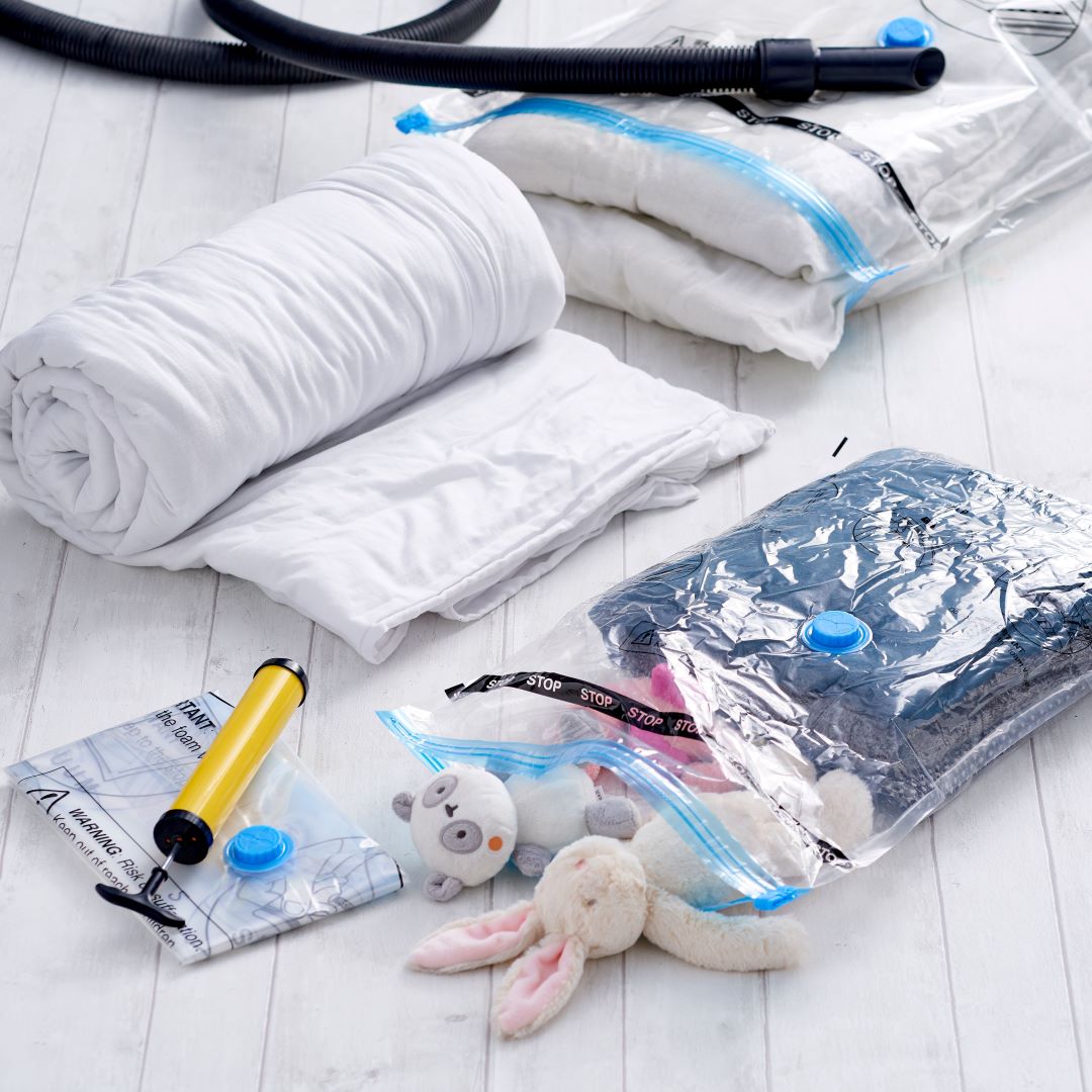 Storing your seasonal clothing, extra bedding, and bulky winter coats without crowding your cupboards is tough. With our vacuum bags, it's easy! Just pack your items, seal the bag, and vacuum out the air through the one-way valve. In seconds, watch them shrink, freeing up space for more storage.