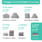 Transform your home organization with our 10 Vacuum Storage Bag Set, including a convenient pump for effortless use. This set is designed to cater to all your storage needs, offering versatile sizes from XL for king-sized bedding to a travel-size small for compact items. Whether you're looking to store seasonal clothing, bedding, or need a compact solution for travel, these vacuum storage bags provide the perfect fit. Their ability to reduce space significantly makes them an essential tool for efficient living.