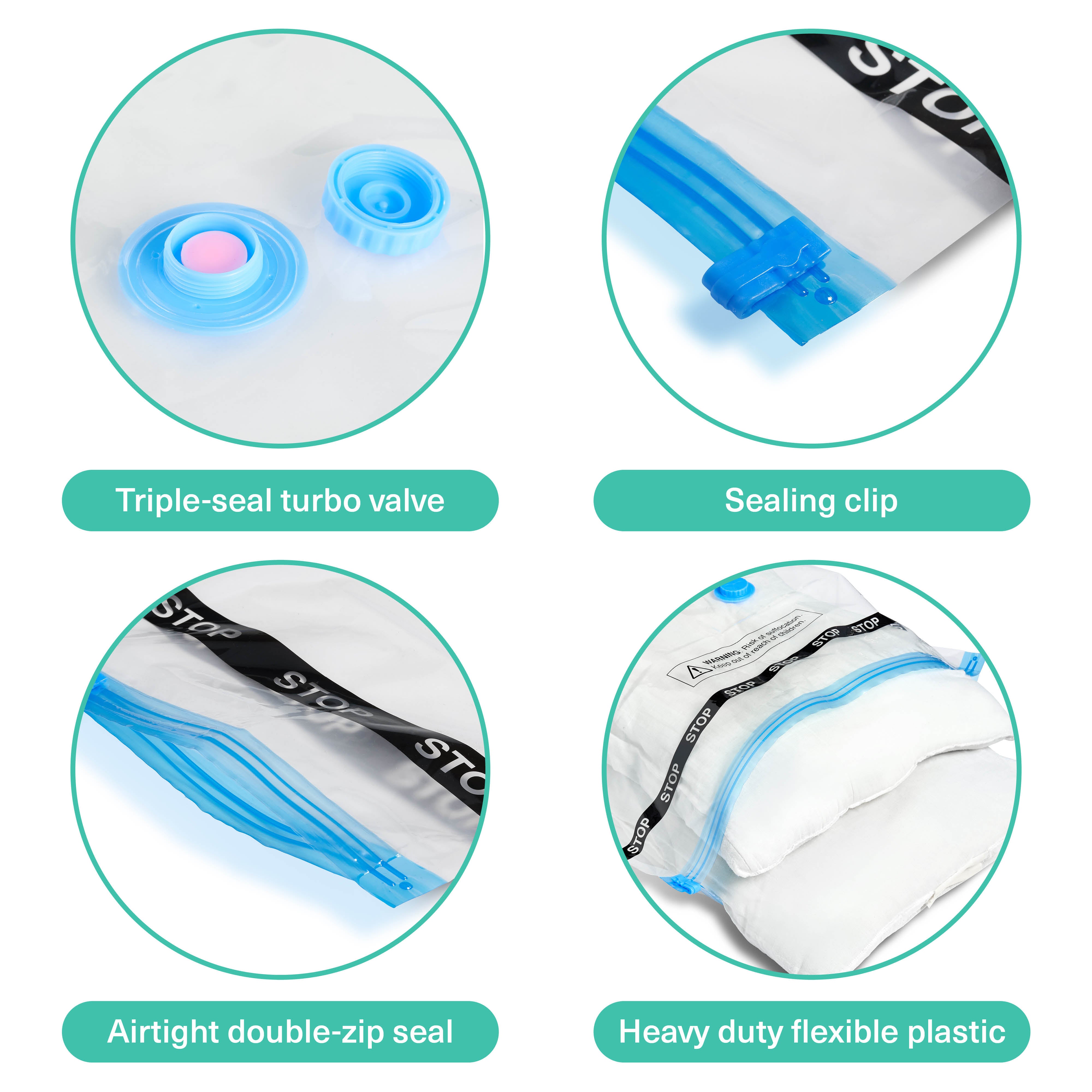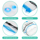 Crafted from heavy-duty flexible plastic, our vacuum storage bags are built to last. The set features a double-zip seal and a triple-seal turbo valve, engineered to prevent air re-entry and keep contents securely contained. These durable bags are not only reliable but also versatile, compatible with both hand pumps and vacuum cleaners. Whether you're optimizing your home storage or preparing for travel, these bags provide a durable and secure solution to help you save space efficiently.