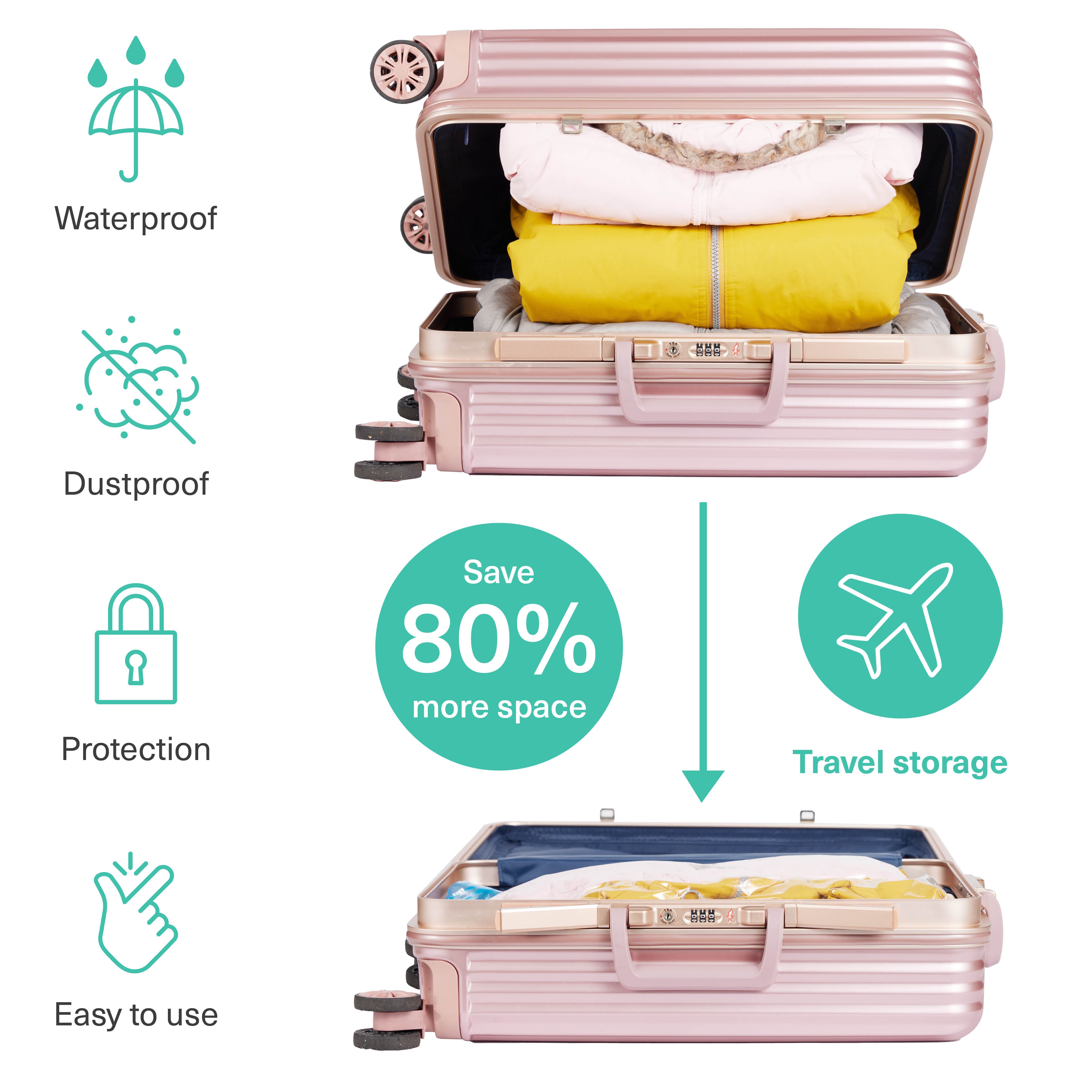 Experience the ultimate convenience with these easy-to-use vacuum storage bags. Simply fill them with your items, vacuum out the air to reduce their size, and enjoy the benefits of extra space. For your travel needs, the small bag can be compressed without a vacuum, merely by rolling, making packing more efficient than ever. Beyond space-saving, these bags offer superior protection, shielding your belongings from water, dust, odour, and mildew, ensuring they remain clean and fresh no matter how long they're stored.