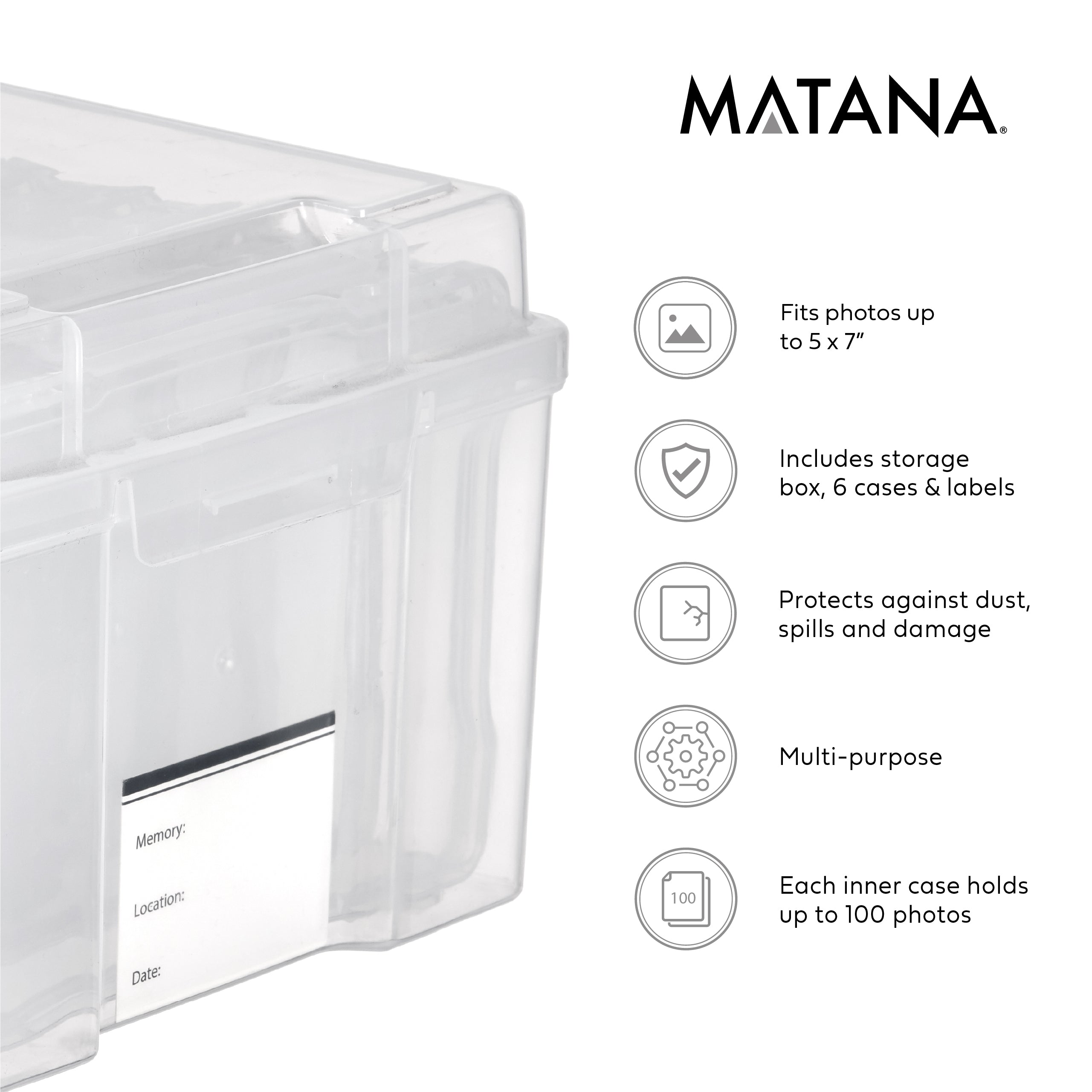 Dive into organization and protection for your cherished memories with our Photo Storage Box Set, featuring 6 individual cases and convenient labelling options. This set is the ideal solution for neatly categorizing and storing up to 600 5R-sized photos (5" x 7" / 12.7 x 17.8 cm), ensuring each memory is preserved and accessible. Whether for professional photographers looking to sort client photos or families keeping memories safe, this box set offers an unparalleled organization system.