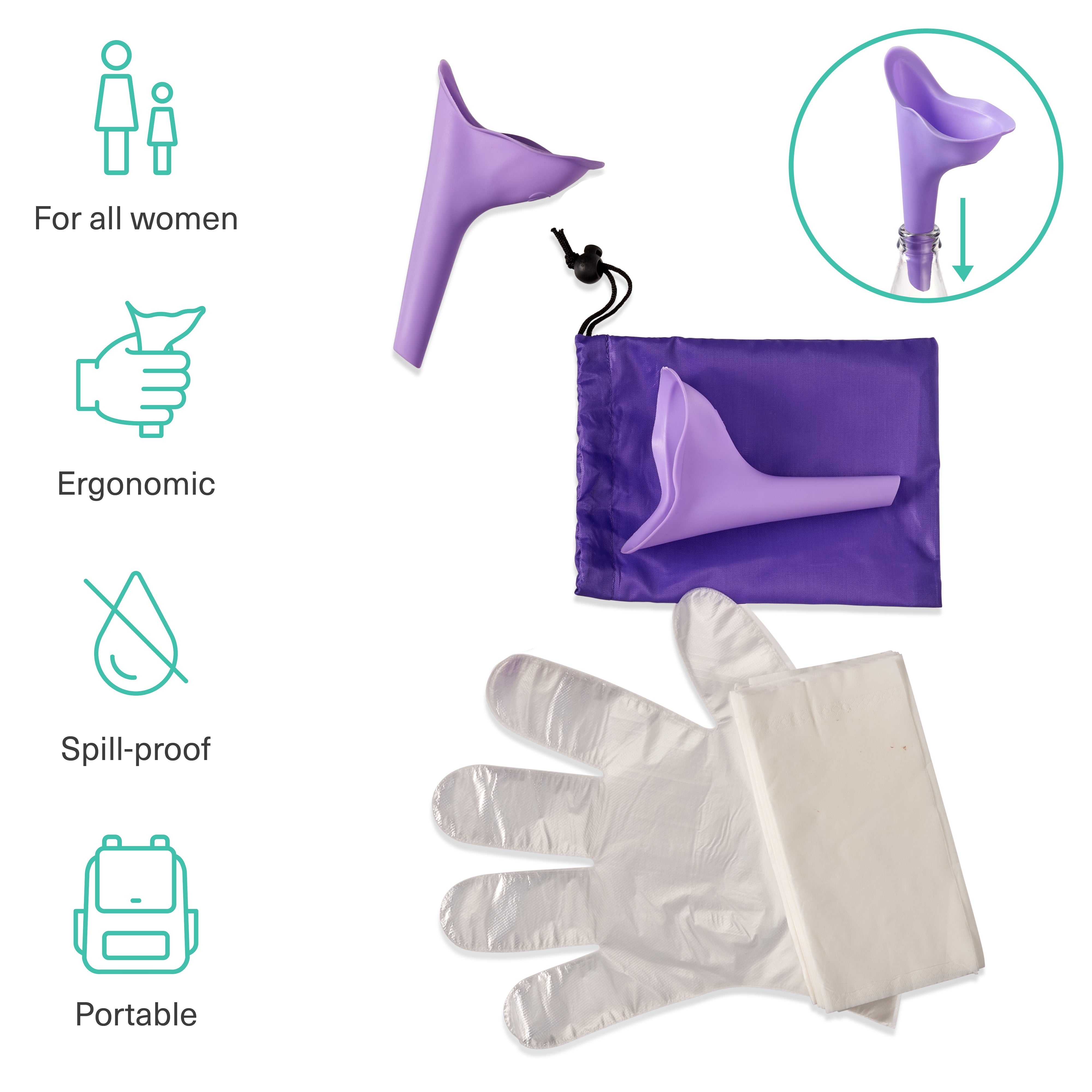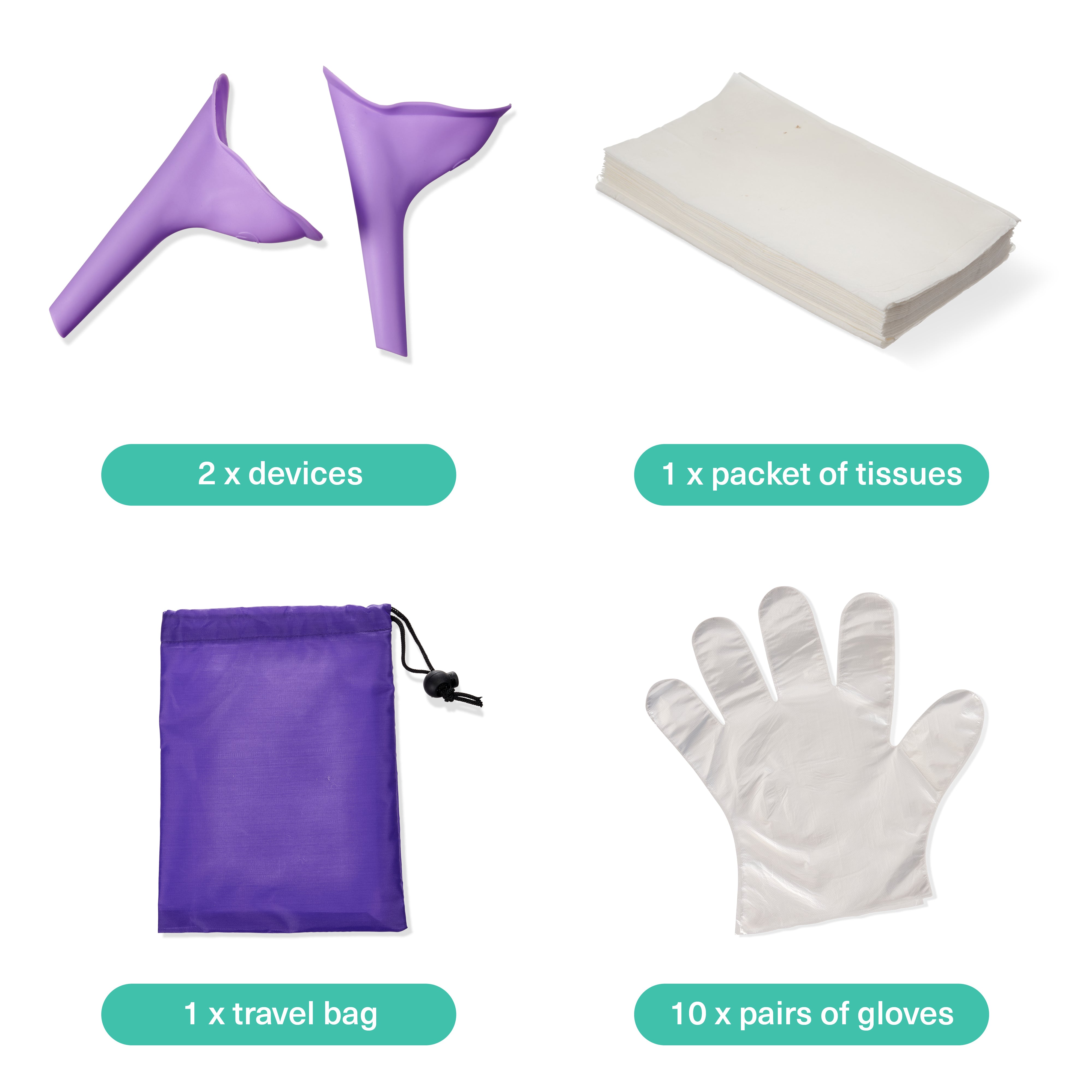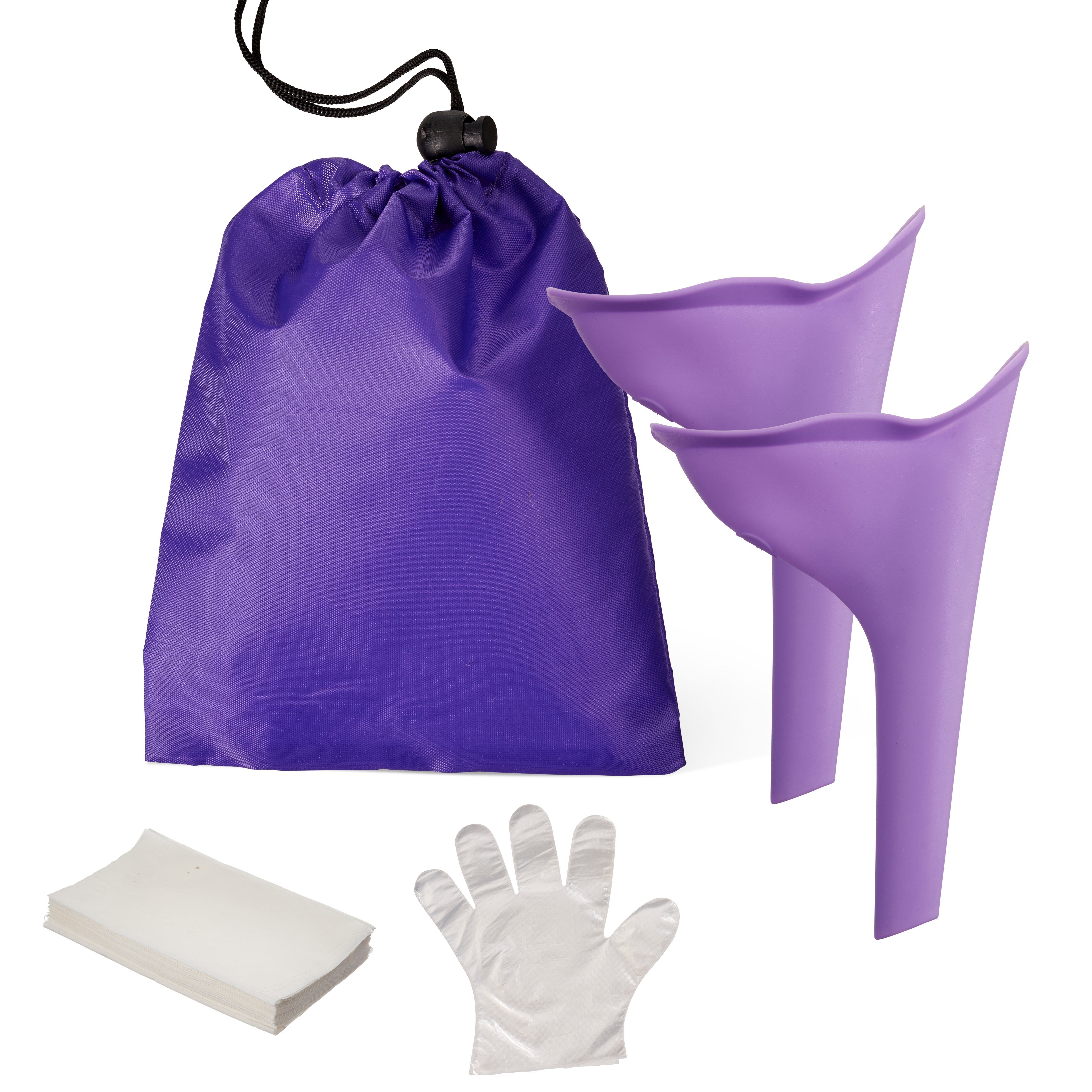 Introducing the ultimate solution for women on the go: our Portable Urination Kit. Designed for the active woman, whether you're at a festival, embarking on a camping trip, or traveling, our kit includes everything you need for a stress-free bathroom experience. With 2 female urination devices, a packet of tissues for cleaning, 10 disposable gloves, and a convenient carry pouch, this set ensures you're prepared for any situation, combining practicality with privacy and hygiene.