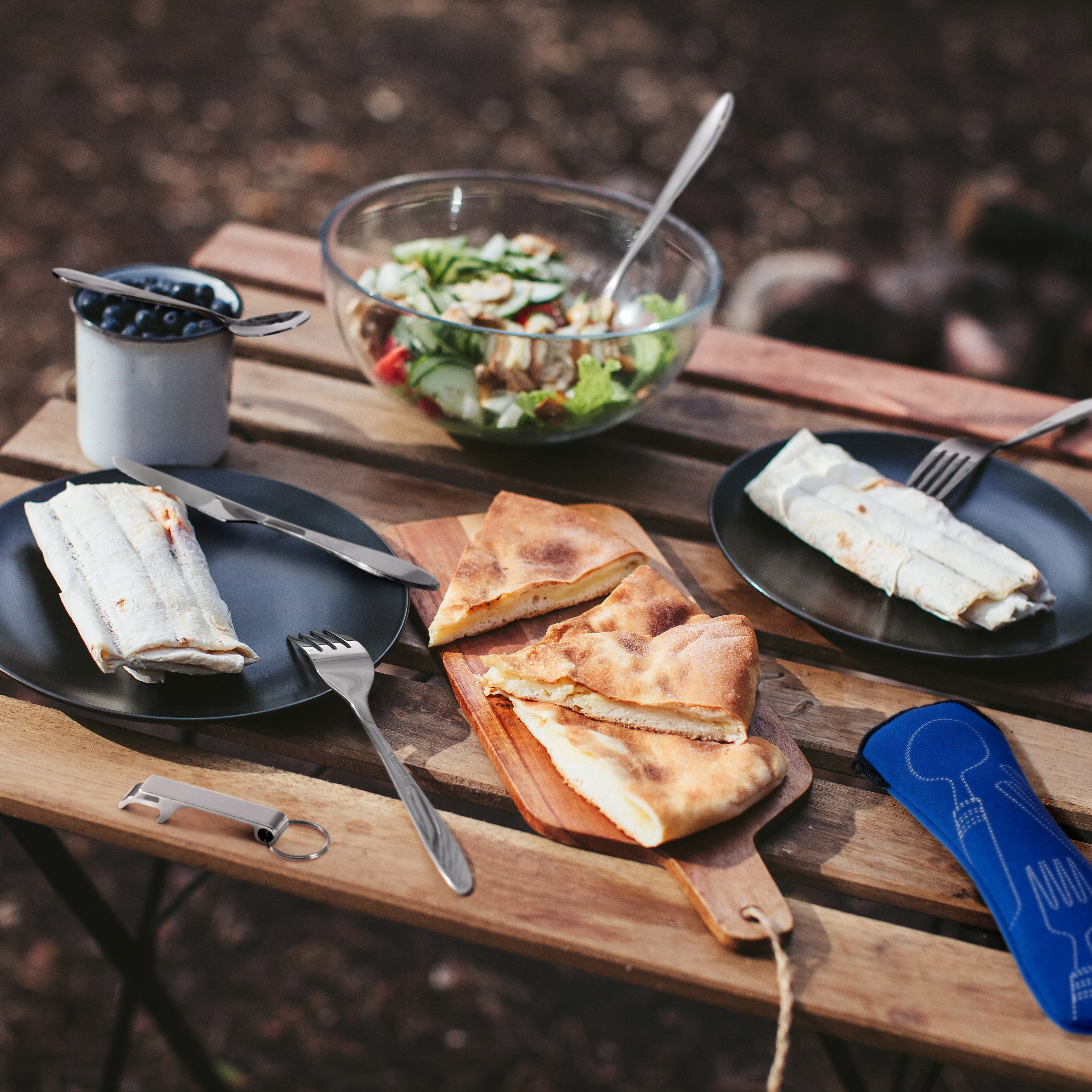 The perfect camping cutlery: This 5-piece cutlery set contains a cutting tool, fork, 2 x spoons (teaspoon, soup spoon) and a bottle opener. Thus, it is perfect for travelling and thanks to the compact shape, it fits in every pocket.