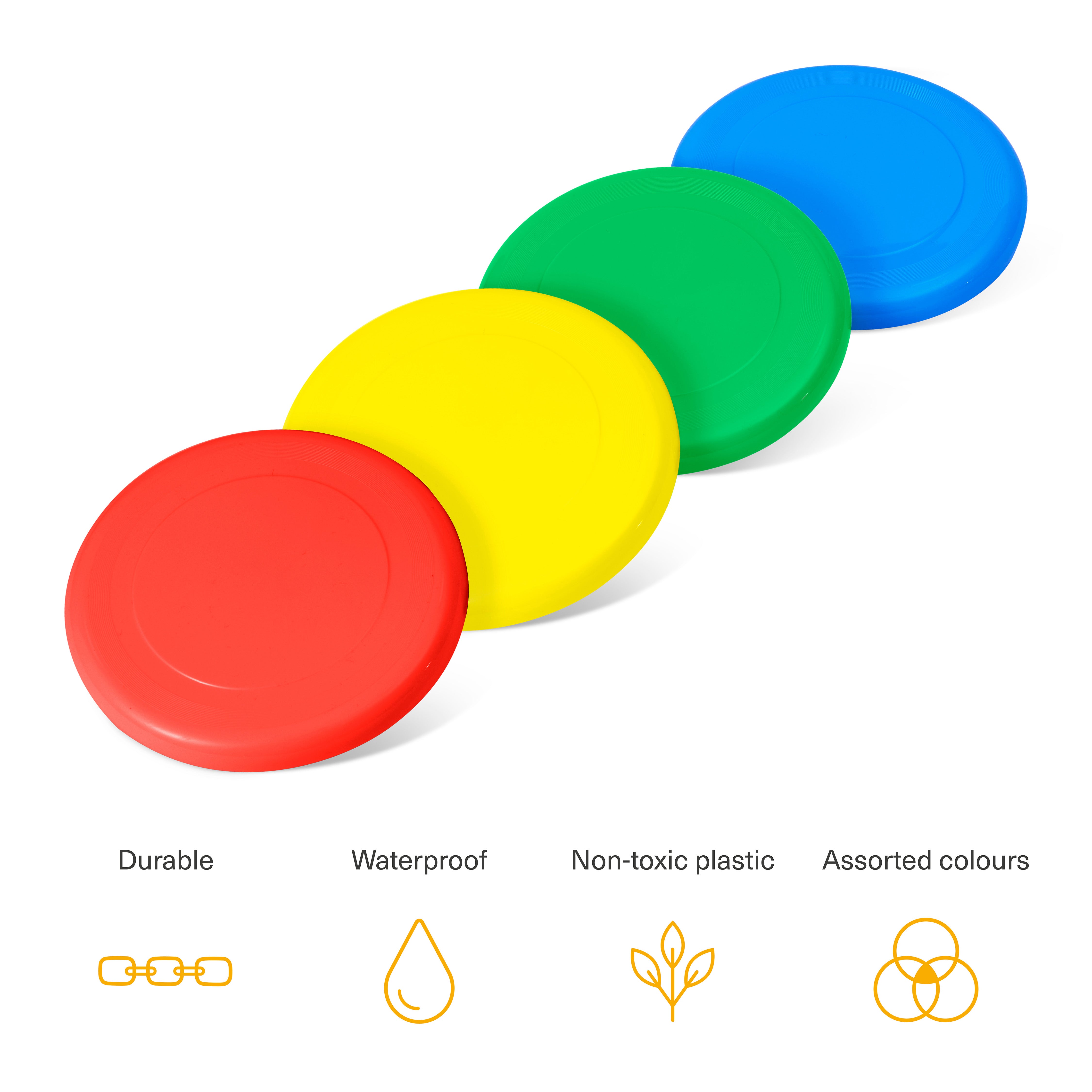 Dive into the fun with our 12-pack of Frisbees, designed to elevate your outdoor activities with their eye-catching colours of red, green, blue, and yellow. These flying discs are not just a source of endless entertainment but also a way to add a splash of colour and excitement to any gathering. Ideal for parks, beaches, backyards, and even as playful options for your pets, our frisbees ensure that family and friends of all ages can share in the laughter and joy that comes with each toss.