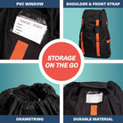 Our travel bag is not just about size; it's crafted for maximum convenience and durability. Made from high-quality 600D polyester with a PU coating, it stands up to the rigors of travel with its water-repellent properties, ensuring that liquids roll off without soaking in. Comfort hasn't been overlooked, with adjustable back straps, extra padding for easy transportation, a handy drawstring closure, and a clear PVC window for quick access and identification. A front handle offers an additional carrying option, making it easier to manoeuvre through busy terminals.